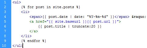 Jekyll使用Liquid模板渲染引擎来生成静态网页,所以我们为了实现博客功能我们就需要在html代码中加入Liquid语言。举个例子,一段包含着Liquid语言的html代码看上去是这样的: