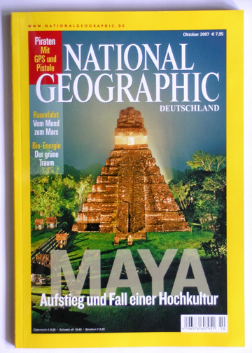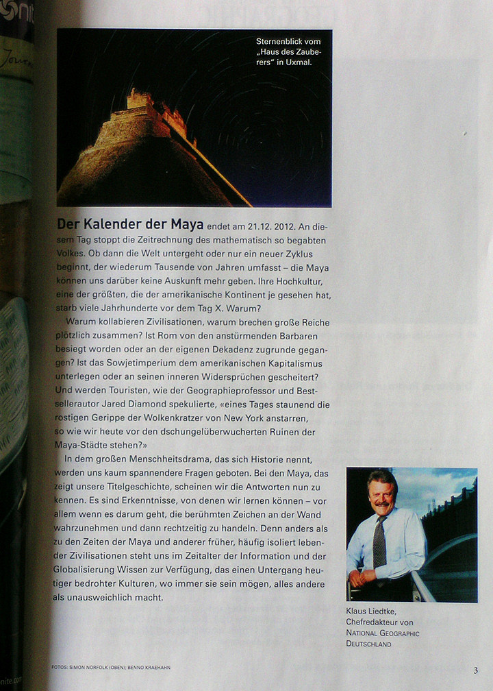 昨天去超市买了本国家地理,德语版的,主要原因是封面上的"MAYA"四个字母,还送一张介绍玛雅兴衰DVD~回到家随便翻了翻,不然不出我所料,翻开第一页就是介绍玛雅的历法...也许很多人都还不知道这个预言,如果不知道,可以在百度或GOOGLE搜索打入"玛雅预言"四个字,你会发现所有的焦点全部汇聚在这个神秘的民族的一个预言上.本来呢我只是以为只是一个传闻,但是昨天我开始觉得这个预言存在的可信度...