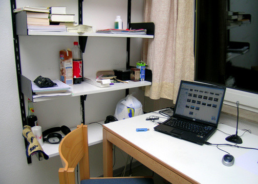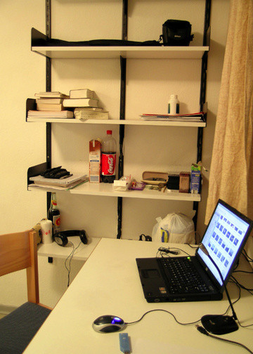 走进房间,一张书桌,一个书架,床在右边~刚刚整理好...