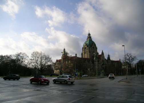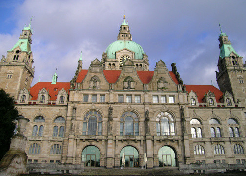 低估了走路的速度,在BUS站喝了半小时西北风,终于,车来了,上车,睡觉,醒来,下车,换火车,继续睡觉,迷迷糊糊中听到有脚步声,睁眼发现火车内空无一人,终点站到了----汉诺威见到LCP之后,老乡见老乡,但是没有两眼泪汪汪,俩大男人在火车站泪汪汪影响不好在汉堡王吃了一只大汉堡之后参观了汉诺威的标志建筑----汉诺威市政厅,传说以前是皇宫建筑,二战时被炸了,后来按原样重建了一个~照片如下: