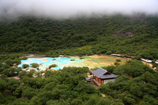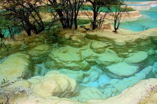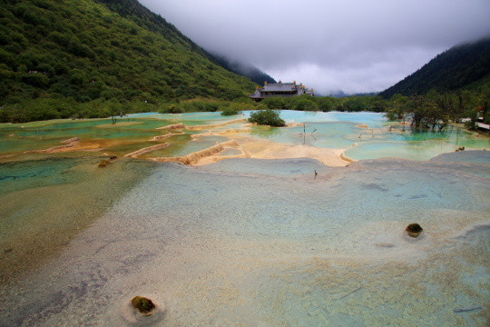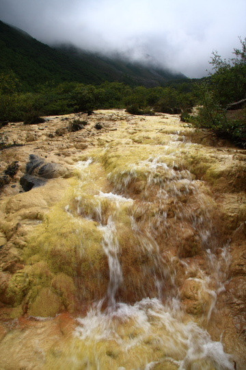 PART Ⅵ 黄龙。并称“九寨黄龙”的“黄龙”,不是那个“黄龙”……就在九寨边上,那鬼地方老高了,山顶上海拔好像3500米左右,我到还没到用氧气瓶的地步,就有点轻微的头脑发胀。从山上下来的水,流在这种黄色的土上,一直流到山下,不是很宽,确实是名副其实的“黄龙”。