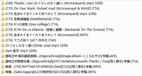 14张专辑,将近一半是M.Graveryard做的寒蝉系列。当时也是因为在贪婪大陆月刊里面听到了那首YOU才决定开始接触同人音乐的,所以毫无疑问地,这个乐队做的东西我必收。话虽这么说,还差几张还是没下到,很难找的说……