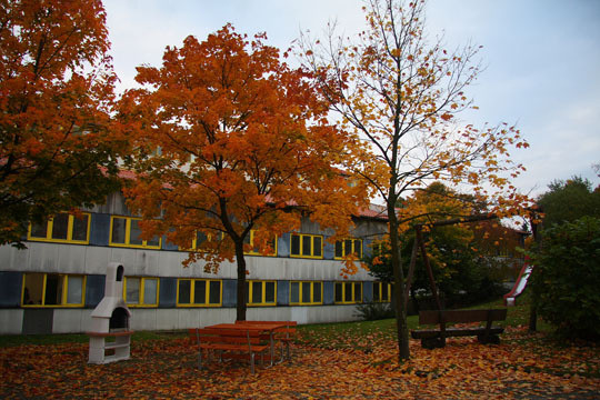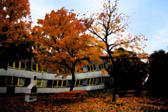 ↑ 刚回来的时候就看中了这片景色,离开前茂密的绿色如今已经换成了如此丰富的色彩。我很中意这样的颜色,秋雨过后才开始飘落的满地的落叶,带个小烟囱的烤架,一旁的桌子和椅子,还有远处的滑梯,让人不禁感叹,呀,这个美好的世界~~