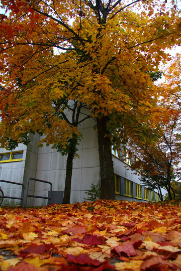 ↑ 还是那丰富的色彩,红的黄的,略带一丝还未褪去的绿色。3天前还没有那么那么多的落叶,一场秋雨过后,泛红的叶子就如同雨后春笋般落地而下……那个,我那天无意说了一句,据说这种叶子碰到水就会由绿变红……(看懂的人很XE……)
