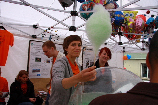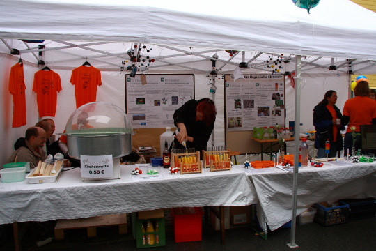 好吧,其实这个活动大部分都是一些社团或者实验室来参展,所以这个……顶上挂着分子结构,拿试管装饮料……还有那个圆圆的东西,不准往下翻,猜猜是什么东东?