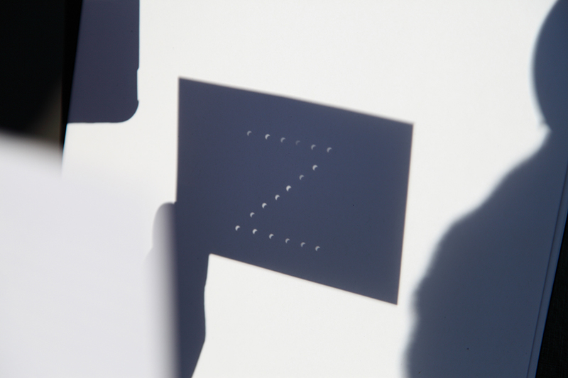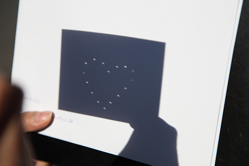 几张小孔成像的图,在纸上戳几个小孔,可以戳成自己喜欢的形状,太阳透过小孔的每一个投影都会变成月牙形。整个日食时间长达2个半小时,无聊了玩玩这个。